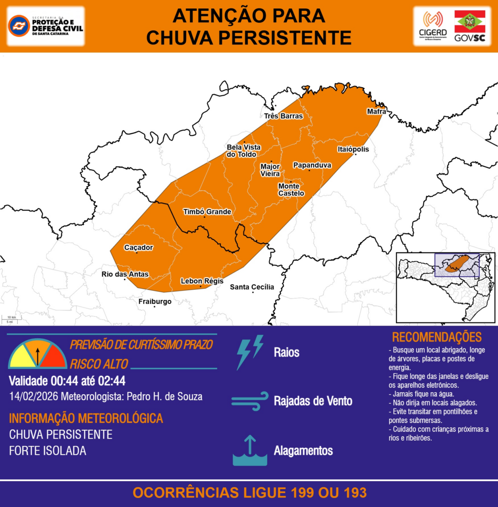 ATENÇÃO – 14/02 00:44 – CHUVA PERSISTENTE de intensidade forte isolada com RAIOS, RAJADAS DE VENTO e ALAGAMENTOS para áreas das regiões do Meio-Oeste e Planalto Norte nas próximas 2 horas. Ocorrências ligue 199 ou 193.
