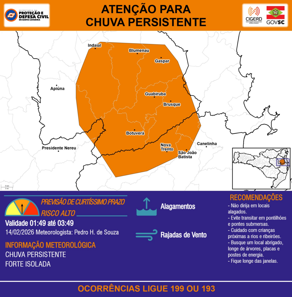 ATENÇÃO – 14/02 01:49 – CHUVA PERSISTENTE de intensidade forte isolada com ALAGAMENTOS e RAJADAS DE VENTO para os municípios de Apiúna, Blumenau, Botuverá, Brusque, Canelinha, Gaspar, Guabiruba, Indaial, Nova Trento, Presidente Nereu, São João Batista nas próximas 2 horas. Ocorrências ligue 199 ou 193.