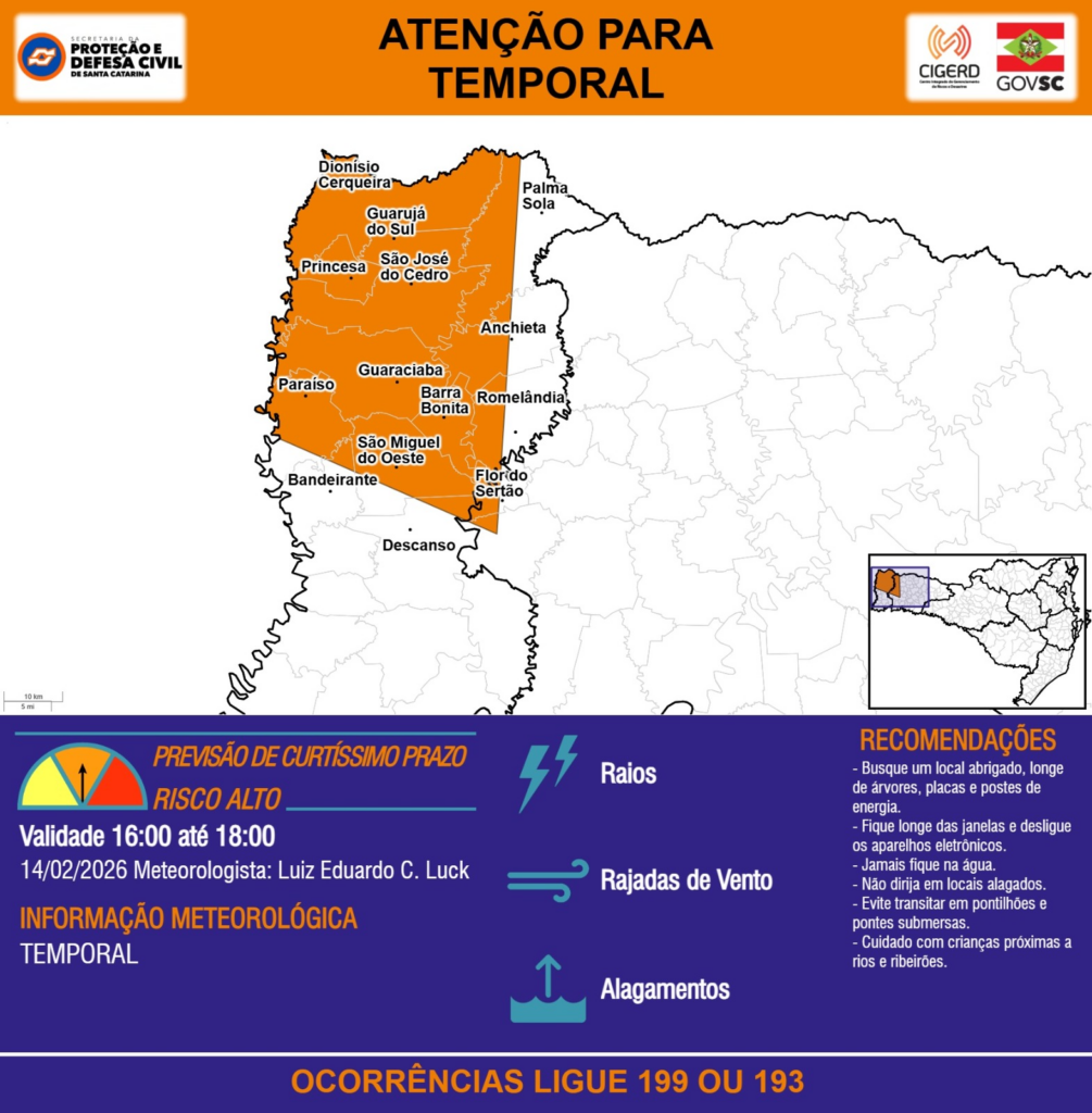 ATENÇÃO – 14/02 16:00 – TEMPORAL com RAIOS, RAJADAS DE VENTO e ALAGAMENTOS para os municípios de Anchieta, Bandeirante, Barra Bonita, Descanso, Dionísio Cerqueira, Flor do Sertão, Guaraciaba, Guarujá do Sul, Palma Sola, Paraíso, Princesa, Romelândia, São José do Cedro, São Miguel do Oeste nas próximas 2 horas. Ocorrências ligue 199 ou 193.