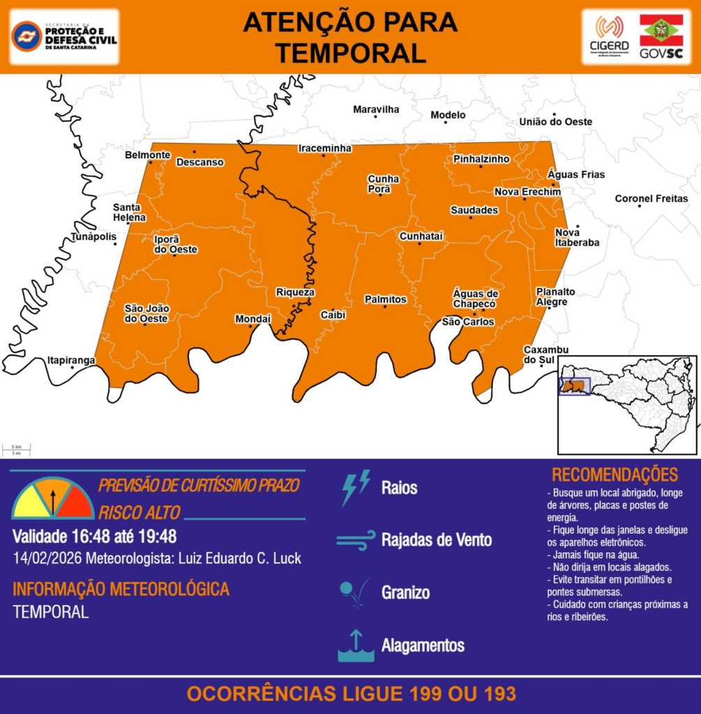 ATENÇÃO – 14/02 16:48 – TEMPORAL com RAIOS, RAJADAS DE VENTO, GRANIZO e ALAGAMENTOS para os municípios de Belmonte, Caibi, Caxambu do Sul, Coronel Freitas, Cunha Porã, Cunhataí, Descanso, Iporã do Oeste, Iraceminha, Itapiranga, Maravilha, Modelo, Mondaí, Nova Erechim, Nova Itaberaba, Palmitos, Pinhalzinho, Planalto Alegre, Riqueza, Santa Helena, Saudades, São Carlos, São João do Oeste, Tunápolis, União do Oeste, Águas Frias e Águas de Chapecó nas próximas 3 horas. Ocorrências ligue 199 ou 193.