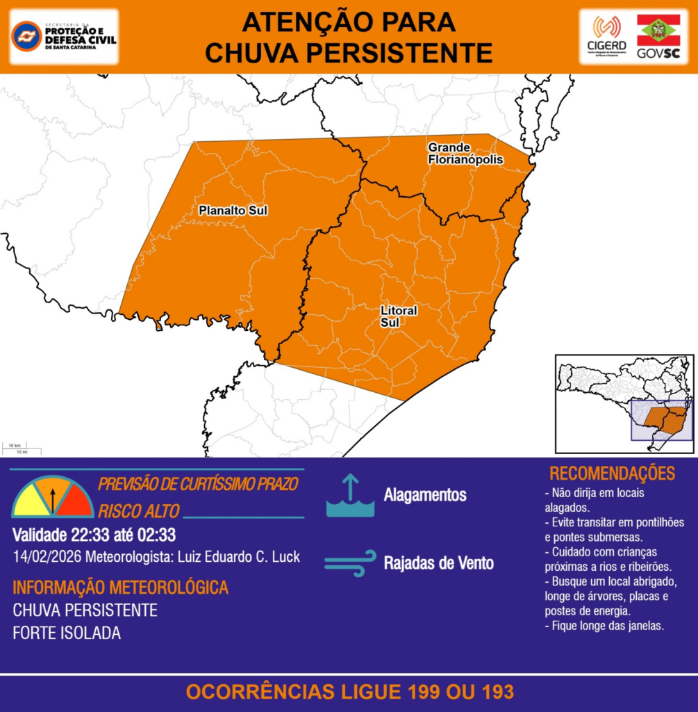 ATENÇÃO – 14/02 22:33 – CHUVA PERSISTENTE de intensidade forte isolada com ALAGAMENTOS e RAJADAS DE VENTO para as regiões do Planalto Sul, Litoral Sul e Grande Florianópolis nas próximas 4 horas. Ocorrências ligue 199 ou 193.