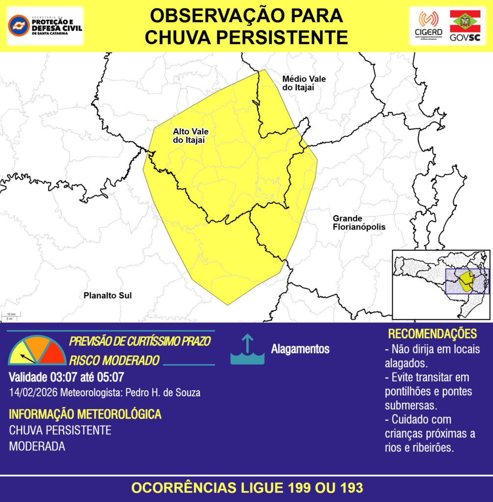 OBSERVAÇÃO – 14/02 03:07 – CHUVA PERSISTENTE de intensidade moderada com ALAGAMENTOS pontuais para áreas das regiões do Planalto Sul, Grande Florianópolis, Médio e Alto Vale do Itajaí nas próximas 2 horas. Ocorrências ligue 199 ou 193.