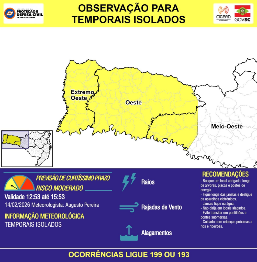 OBSERVAÇÃO – 14/02 12:53 – TEMPORAIS ISOLADOS com RAIOS, RAJADAS DE VENTO e ALAGAMENTOS pontuais para as regiões do Extremo Oeste, Oeste e Meio-Oeste nas próximas 3 horas. Ocorrências ligue 199 ou 193.