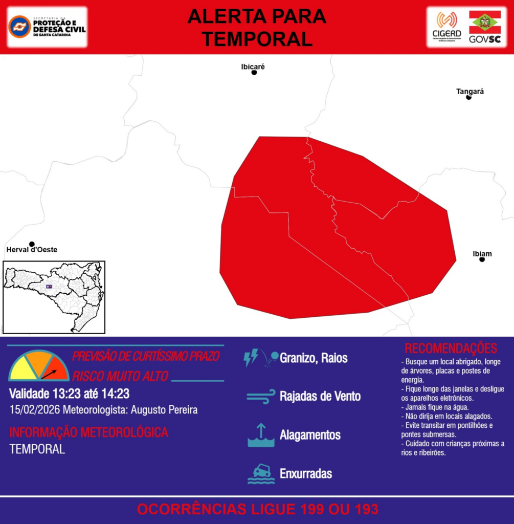 ALERTA – 15/02 13:23 – TEMPORAL com RAJADAS DE VENTO, ALAGAMENTOS, GRANIZO, RAIOS e risco de ENXURRADAS para os municípios de Herval d’Oeste, Ibiam, Ibicaré e Tangará na próxima hora. Ocorrências ligue 199 ou 193.