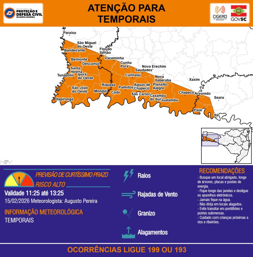 ATENÇÃO – 15/02 11:25 – TEMPORAIS com RAIOS, RAJADAS DE VENTO, GRANIZO e ALAGAMENTOS para os municípios de Arvoredo, Bandeirante, Belmonte, Caibi, Caxambu do Sul, Chapecó, Cunha Porã, Cunhataí, Descanso, Flor do Sertão, Guatambu, Iporã do Oeste, Iraceminha, Itapiranga, Itá, Mondaí, Nova Erechim, Nova Itaberaba, Paial, Palmitos, Paraíso, Planalto Alegre, Riqueza, Santa Helena, Saudades, Seara, São Carlos, São João do Oeste, São Miguel do Oeste, Tunápolis, Xaxim e Águas de Chapecó nas próximas 2 horas. Ocorrências ligue 199 ou 193.
