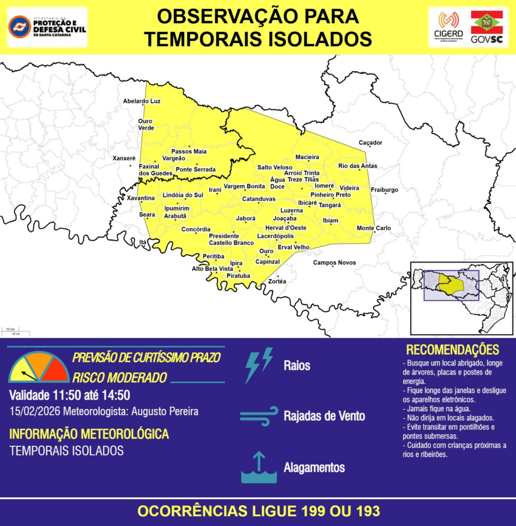OBSERVAÇÃO – 15/02 11:50 – TEMPORAIS ISOLADOS com RAIOS, RAJADAS DE VENTO e ALAGAMENTOS pontuais para as regiões do Oeste e Meio-Oeste nas próximas 3 horas. Ocorrências ligue 199 ou 193.