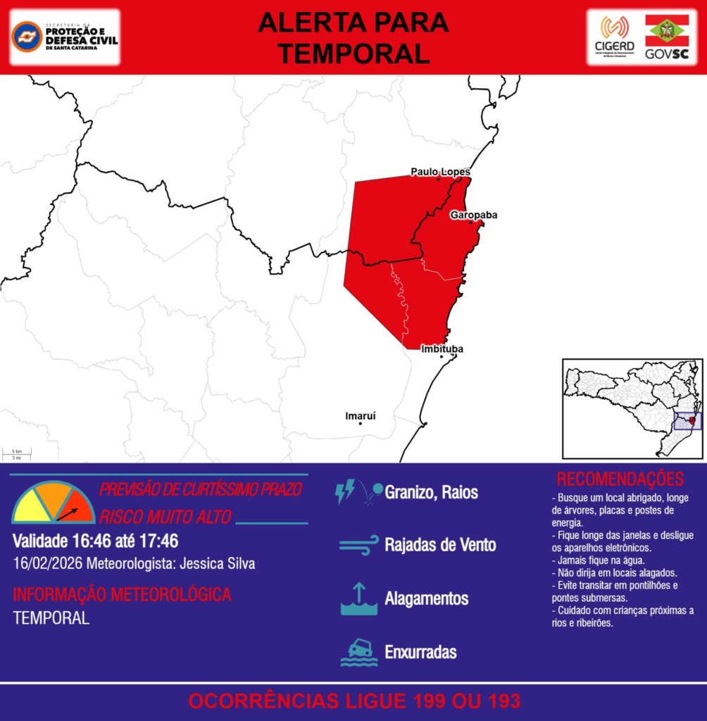 ALERTA – 16/02 16:46 – TEMPORAL com RAJADAS DE VENTO, ALAGAMENTOS, GRANIZO, RAIOS e risco de ENXURRADAS para os municípios de Garopaba, Imaruí, Imbituba e Paulo Lopes na próxima hora. Ocorrências ligue 199 ou 193.