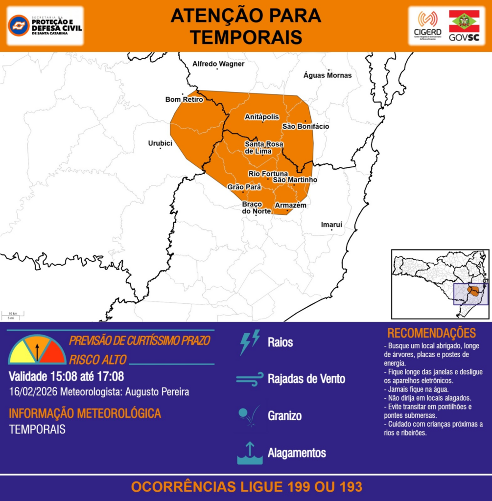 ATENÇÃO – 16/02 15:08 – TEMPORAIS com RAIOS, RAJADAS DE VENTO, GRANIZO e ALAGAMENTOS para os municípios de Alfredo Wagner, Anitápolis, Armazém, Bom Retiro, Braço do Norte, Grão Pará, Imaruí, Rio Fortuna, Santa Rosa de Lima, São Bonifácio, São Martinho, Urubici e Águas Mornas nas próximas 2 horas. Ocorrências ligue 199 ou 193.