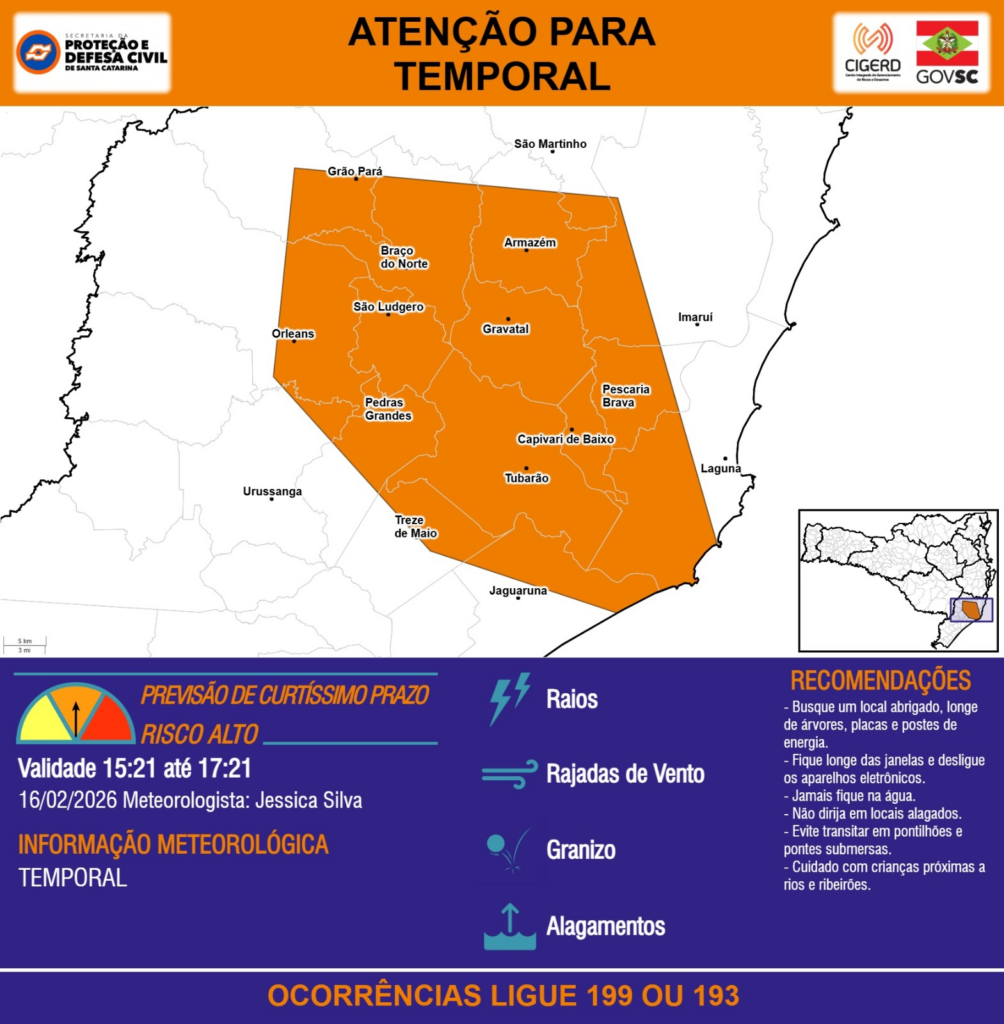 ATENÇÃO – 16/02 15:21 – TEMPORAL com RAIOS, RAJADAS DE VENTO, GRANIZO e ALAGAMENTOS para os municípios de Armazém, Braço do Norte, Capivari de Baixo, Gravatal, Grão Pará, Imaruí, Jaguaruna, Laguna, Orleans, Pedras Grandes, Pescaria Brava, São Ludgero, São Martinho, Treze de Maio, Tubarão e Urussanga nas próximas 2 horas. Ocorrências ligue 199 ou 193.