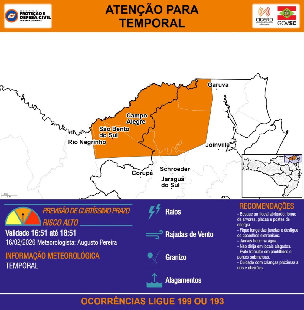 ATENÇÃO – 16/02 16:53 – TEMPORAL com RAIOS, RAJADAS DE VENTO, GRANIZO e ALAGAMENTOS nas próximas 2 horas. Ocorrências ligue 199 ou 193.