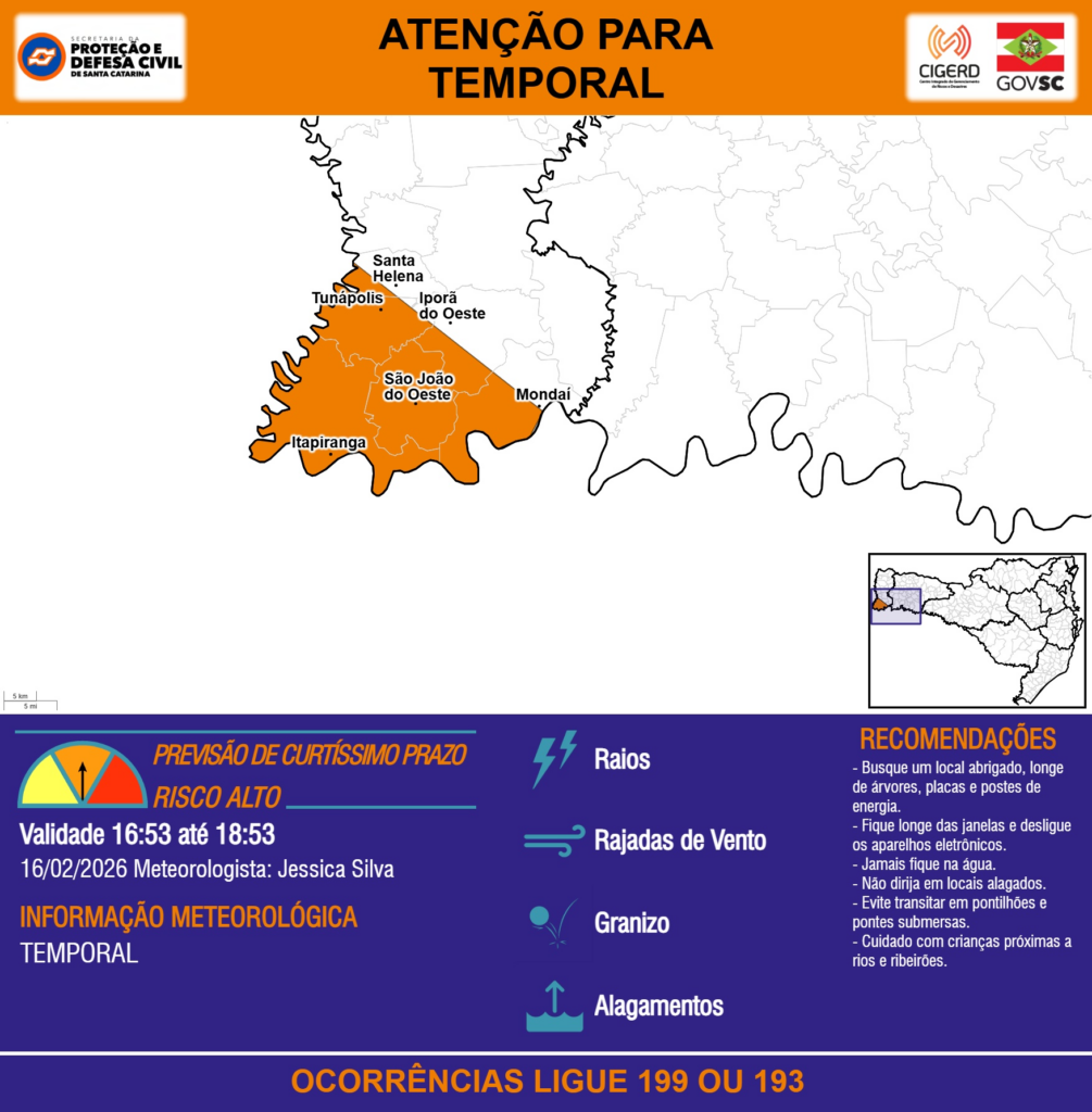 ATENÇÃO – 16/02 16:53 – TEMPORAL com RAIOS, RAJADAS DE VENTO, GRANIZO e ALAGAMENTOS para os municípios de Iporã do Oeste, Itapiranga, Mondaí, Santa Helena, São João do Oeste e Tunápolis nas próximas 2 horas. Ocorrências ligue 199 ou 193.