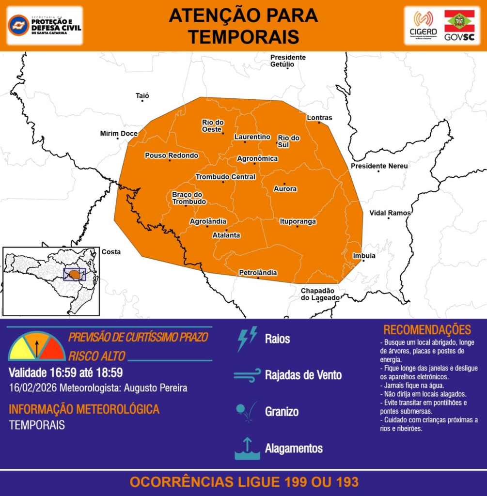 ATENÇÃO – 16/02 16:59 – TEMPORAIS com RAIOS, RAJADAS DE VENTO, GRANIZO e ALAGAMENTOS para os municípios de Agrolândia, Agronômica, Atalanta, Aurora, Braço do Trombudo, Chapadão do Lageado, Imbuia, Ituporanga, Laurentino, Lontras, Mirim Doce, Otacílio Costa, Petrolândia, Pouso Redondo, Presidente Getúlio, Presidente Nereu, Rio do Oeste, Rio do Sul, Taió, Trombudo Central e Vidal Ramos nas próximas 2 horas. Ocorrências ligue 199 ou 193.