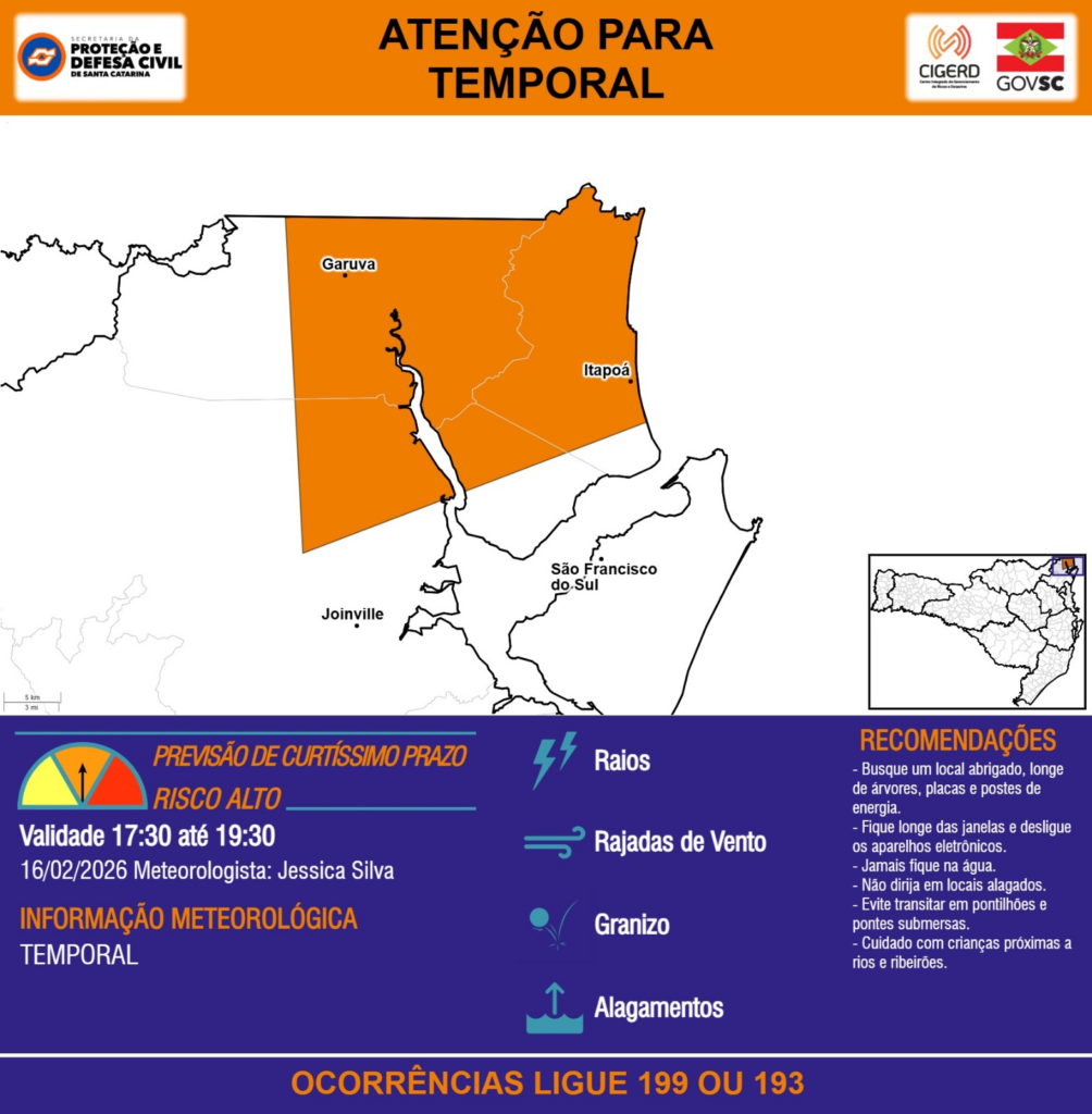 ATENÇÃO – 16/02 17:30 – TEMPORAL com RAIOS, RAJADAS DE VENTO, GRANIZO e ALAGAMENTOS para os municípios de Garuva, Itapoá, Joinville e São Francisco do Sul nas próximas 2 horas. Ocorrências ligue 199 ou 193.