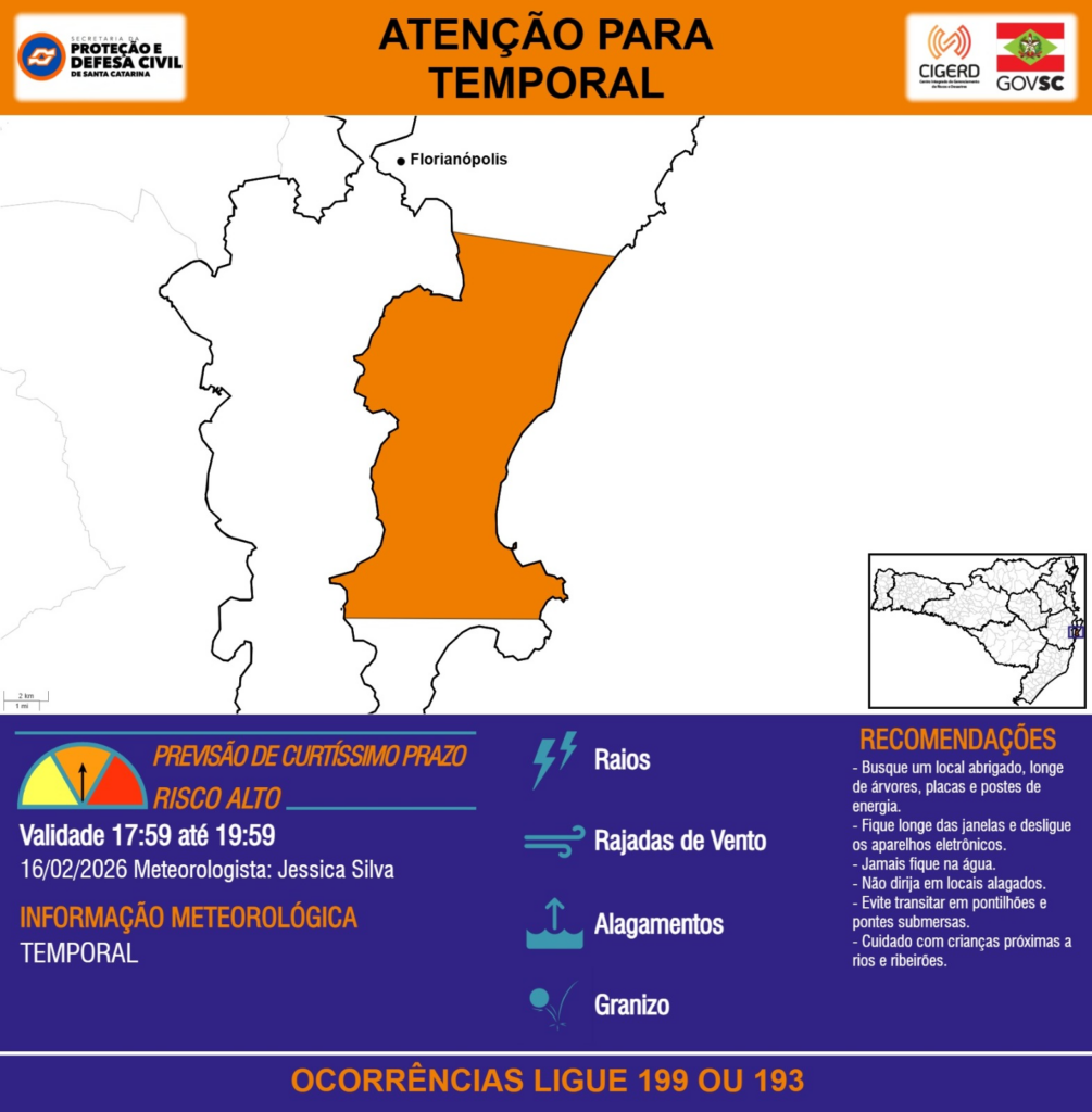 ATENÇÃO – 16/02 17:59 – TEMPORAL com RAIOS, RAJADAS DE VENTO, ALAGAMENTOS e GRANIZO para o município de Florianópolis nas próximas 2 horas. Ocorrências ligue 199 ou 193.