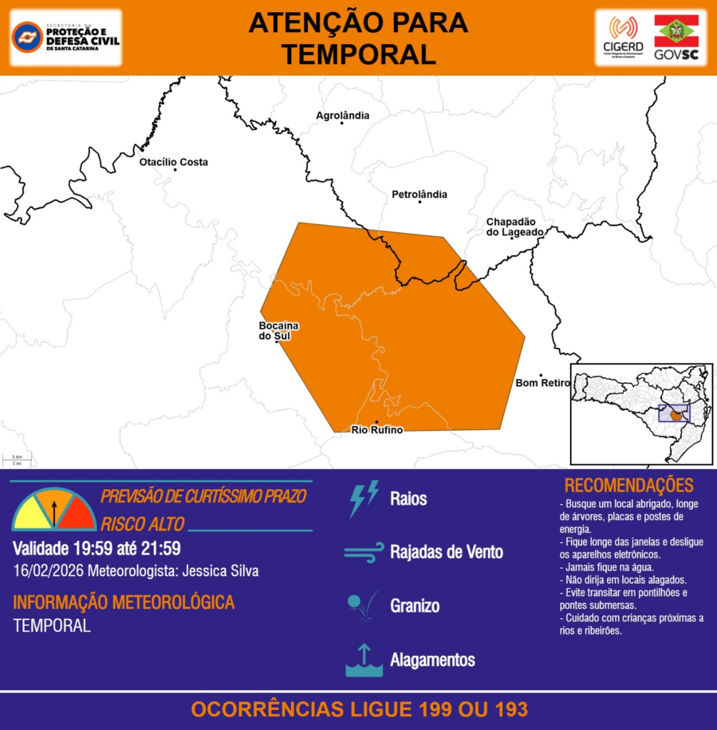 ATENÇÃO – 16/02 19:59 – TEMPORAL com RAIOS, RAJADAS DE VENTO, GRANIZO e ALAGAMENTOS para os municípios de Agrolândia, Bocaina do Sul, Bom Retiro, Chapadão do Lageado, Otacílio Costa, Petrolândia e Rio Rufino nas próximas 2 horas. Ocorrências ligue 199 ou 193.