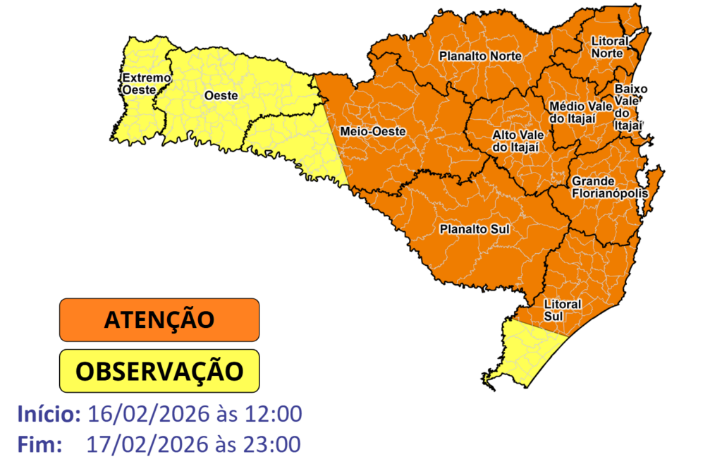 A Defesa Civil de Santa Catarina reforça a importância de acompanhar os avisos e atualizações nos canais oficiais.