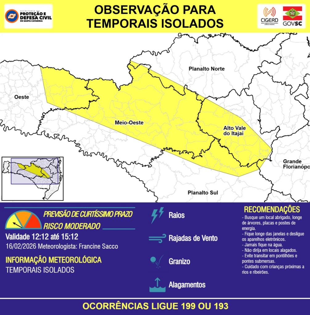 OBSERVAÇÃO – 16/02 12:12 – TEMPORAIS ISOLADOS com RAIOS, RAJADAS DE VENTO, GRANIZO e ALAGAMENTOS pontuais para as regiões do Oeste, Meio-Oeste, Planalto Norte, Planalto Sul, Grande Florianópolis e Alto Vale do Itajaí nas próximas 3 horas. Ocorrências ligue 199 ou 193.