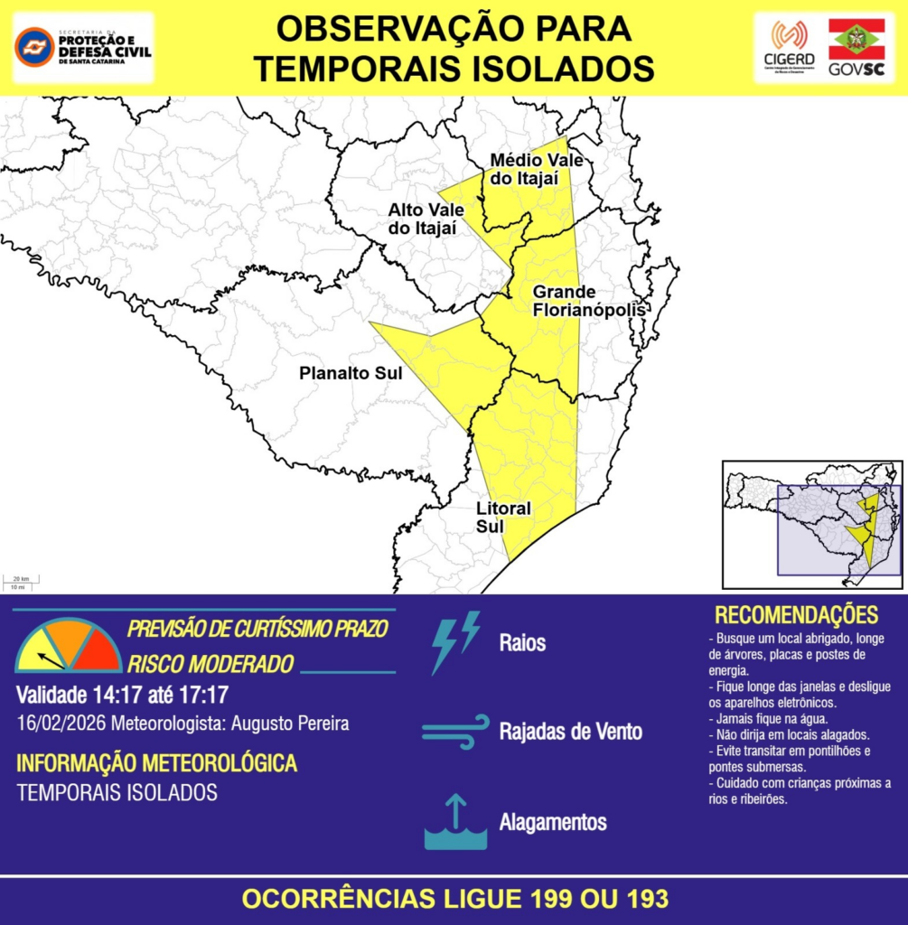 OBSERVAÇÃO – 16/02 14:17 – TEMPORAIS ISOLADOS com RAIOS, RAJADAS DE VENTO e ALAGAMENTOS pontuais para as regiões do Planalto Sul, Litoral Sul, Grande Florianópolis, Médio e Alto Vale do Itajaí nas próximas 3 horas. Ocorrências ligue 199 ou 193.