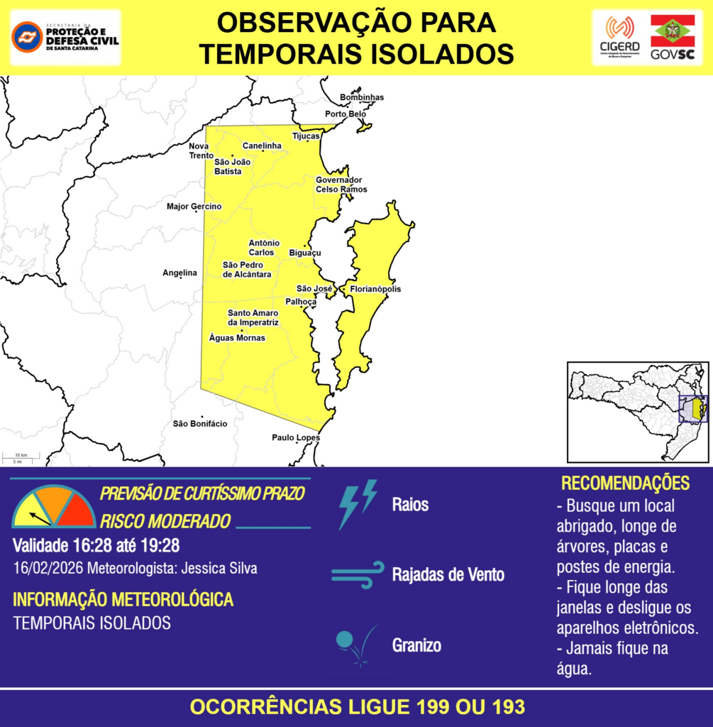 OBSERVAÇÃO – 16/02 16:28 – TEMPORAIS ISOLADOS com RAIOS, RAJADAS DE VENTO e GRANIZO para as regiões da Grande Florianópolis e Baixo Vale do Itajaí nas próximas 3 horas. Ocorrências ligue 199 ou 193.