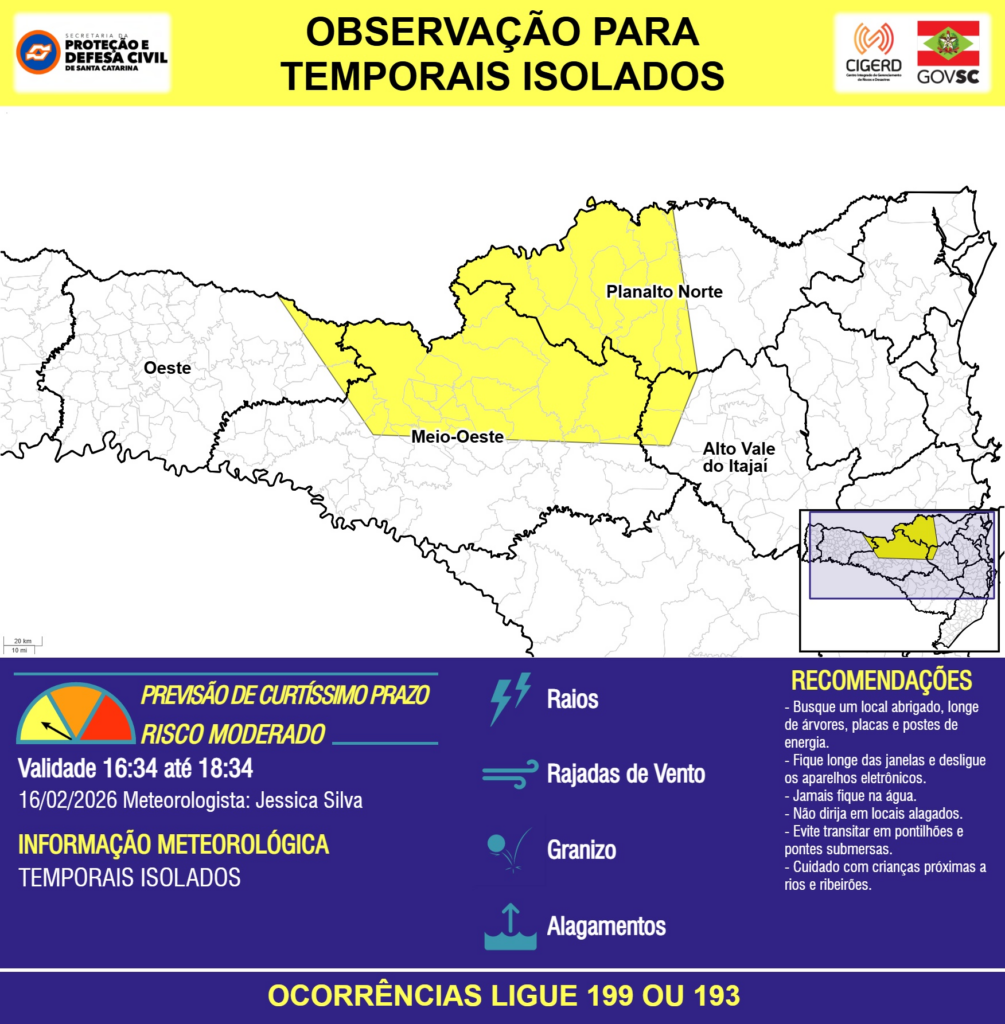 OBSERVAÇÃO – 16/02 16:34 – TEMPORAIS ISOLADOS com RAIOS, RAJADAS DE VENTO, GRANIZO e ALAGAMENTOS pontuais para as regiões do Oeste, Meio-Oeste, Planalto Norte e Alto Vale do Itajaí nas próximas 2 horas. Ocorrências ligue 199 ou 193.