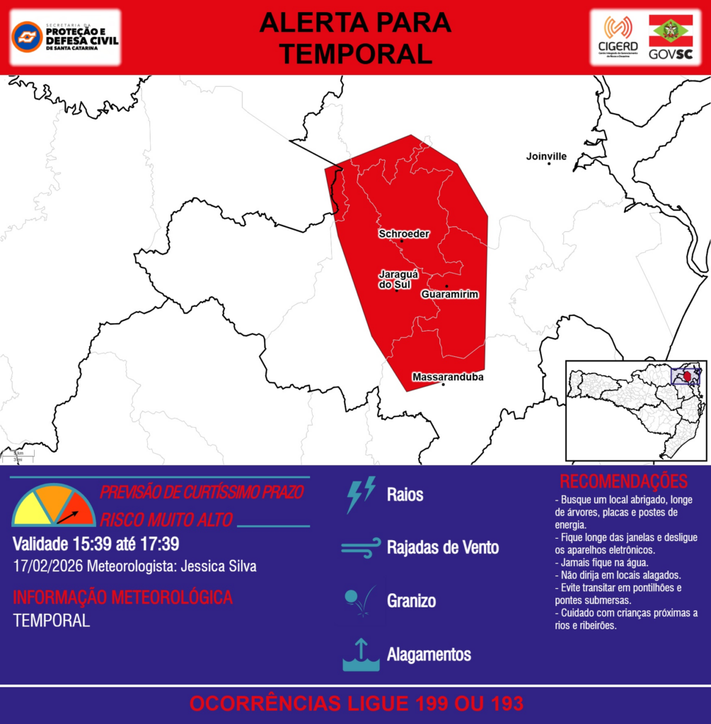 ALERTA – 17/02 15:39 – TEMPORAL com RAIOS, RAJADAS DE VENTO, GRANIZO e ALAGAMENTOS para os municípios de Guaramirim, Jaraguá do Sul, Joinville, Massaranduba e Schroeder nas próximas 2 horas. Ocorrências ligue 199 ou 193.