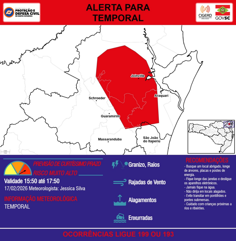 ALERTA – 17/02 15:50 – TEMPORAL com RAJADAS DE VENTO, ALAGAMENTOS, GRANIZO, RAIOS e risco de ENXURRADAS para os municípios de Araquari, Guaramirim, Joinville, Massaranduba, Schroeder e São João do Itaperiú nas próximas 2 horas. Ocorrências ligue 199 ou 193.
