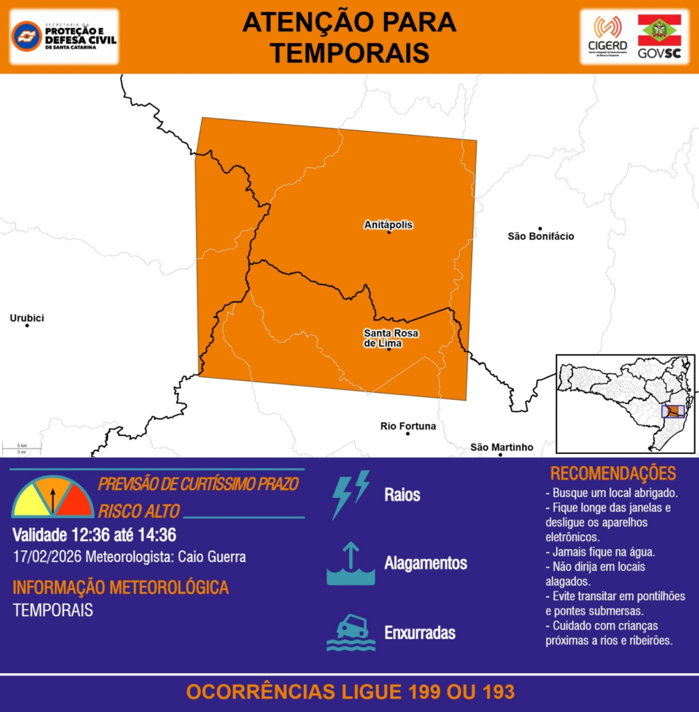 ATENÇÃO – 17/02 12:36 – TEMPORAIS com RAIOS, ALAGAMENTOS e risco de ENXURRADAS para os municípios de Alfredo Wagner, Anitápolis, Grão Pará, Rancho Queimado, Rio Fortuna, Santa Rosa de Lima, São Bonifácio, São Martinho, Urubici e Águas Mornas nas próximas 2 horas. Ocorrências ligue 199 ou 193.
