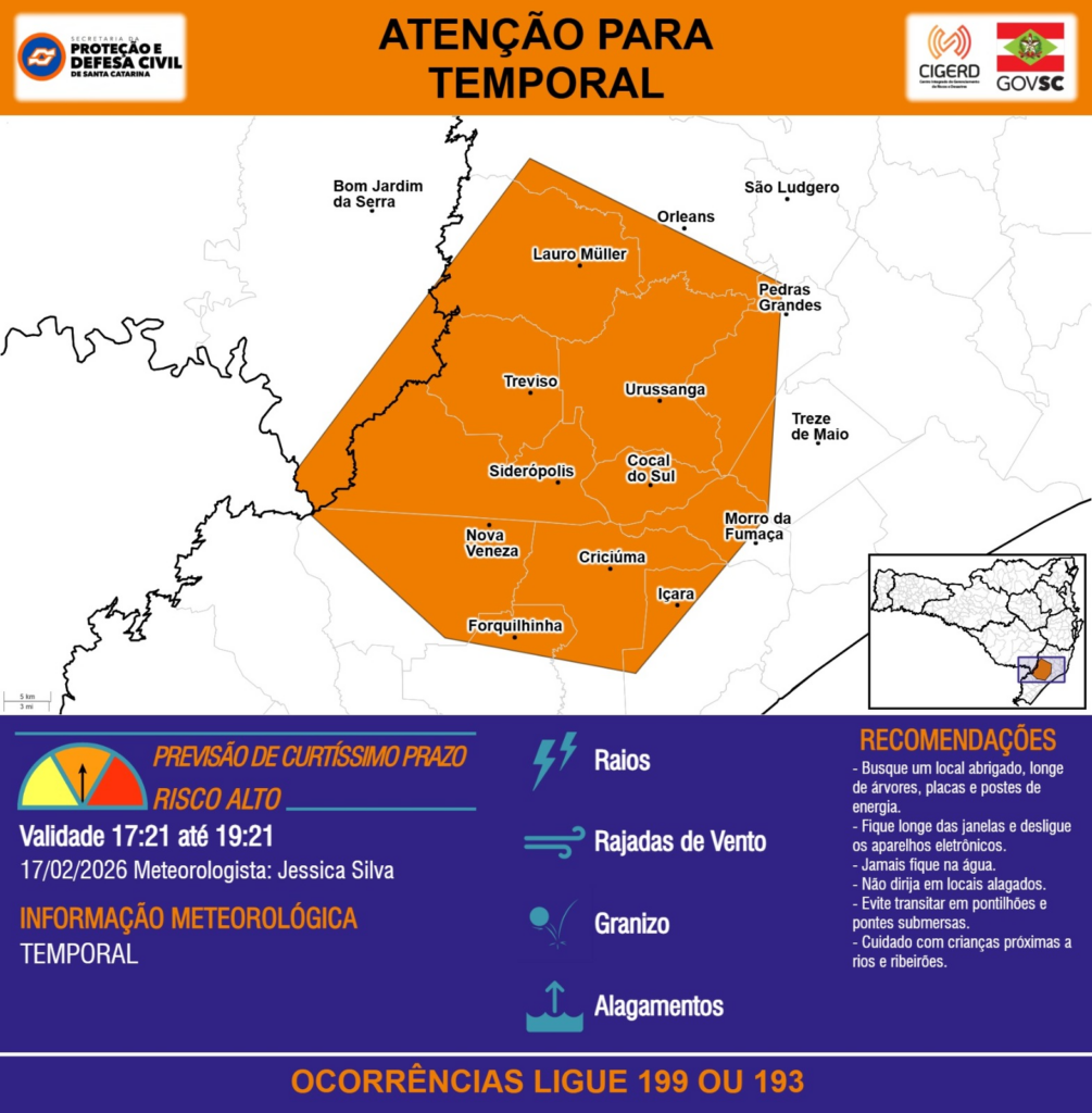 ATENÇÃO – 17/02 17:21 – TEMPORAL com RAIOS, RAJADAS DE VENTO, GRANIZO e ALAGAMENTOS para os municípios de Bom Jardim da Serra, Cocal do Sul, Criciúma, Forquilhinha, Içara, Lauro Müller, Morro da Fumaça, Nova Veneza, Orleans, Pedras Grandes, Siderópolis, São Ludgero, Treviso, Treze de Maio e Urussanga nas próximas 2 horas. Ocorrências ligue 199 ou 193.