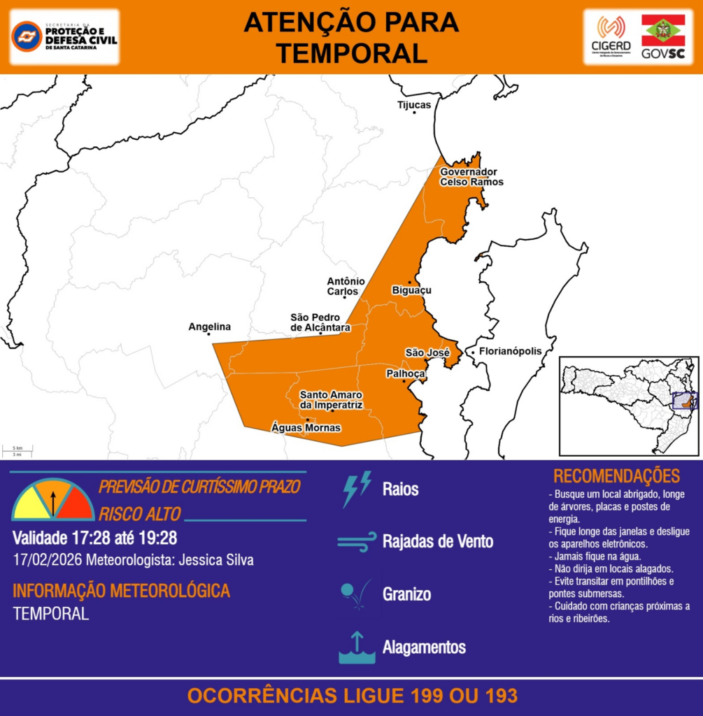 ATENÇÃO – 17/02 17:28 – TEMPORAL com RAIOS, RAJADAS DE VENTO, GRANIZO e ALAGAMENTOS para os municípios de Angelina, Antônio Carlos, Biguaçu, Florianópolis, Governador Celso Ramos, Palhoça, Santo Amaro da Imperatriz, São José, São Pedro de Alcântara, Tijucas e Águas Mornas nas próximas 2 horas. Ocorrências ligue 199 ou 193.