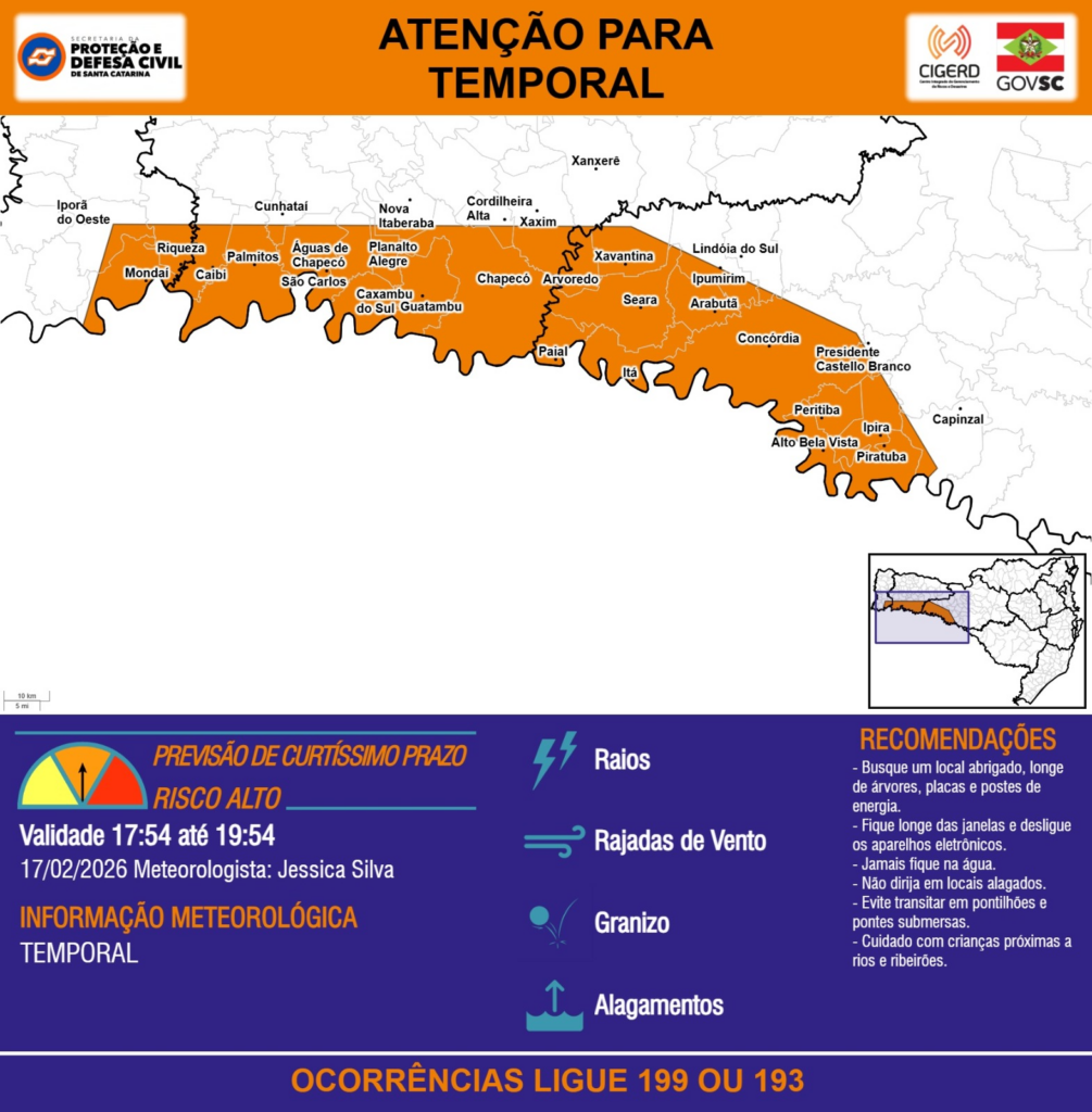 ATENÇÃO – 17/02 17:54 – TEMPORAL com RAIOS, RAJADAS DE VENTO, GRANIZO e ALAGAMENTOS para os municípios de Alto Bela Vista, Arabutã, Arvoredo, Caibi, Capinzal, Caxambu do Sul, Chapecó, Concórdia, Cordilheira Alta, Cunhataí, Guatambu, Ipira, Iporã do Oeste, Ipumirim, Itá, Lindóia do Sul, Mondaí, Nova Itaberaba, Paial, Palmitos, Peritiba, Piratuba, Planalto Alegre, Presidente Castello Branco, Riqueza, Seara, São Carlos, Xanxerê, Xavantina, Xaxim e Águas de Chapecó nas próximas 2 horas. Ocorrências ligue 199 ou 193.
