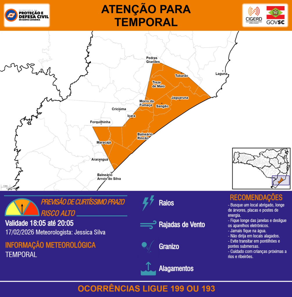 ATENÇÃO – 17/02 18:05 – TEMPORAL com RAIOS, RAJADAS DE VENTO, GRANIZO e ALAGAMENTOS para os municípios de Araranguá, Balneário Arroio do Silva, Balneário Rincão, Criciúma, Forquilhinha, Içara, Jaguaruna, Laguna, Maracajá, Morro da Fumaça, Pedras Grandes, Sangão, Treze de Maio e Tubarão nas próximas 2 horas. Ocorrências ligue 199 ou 193.