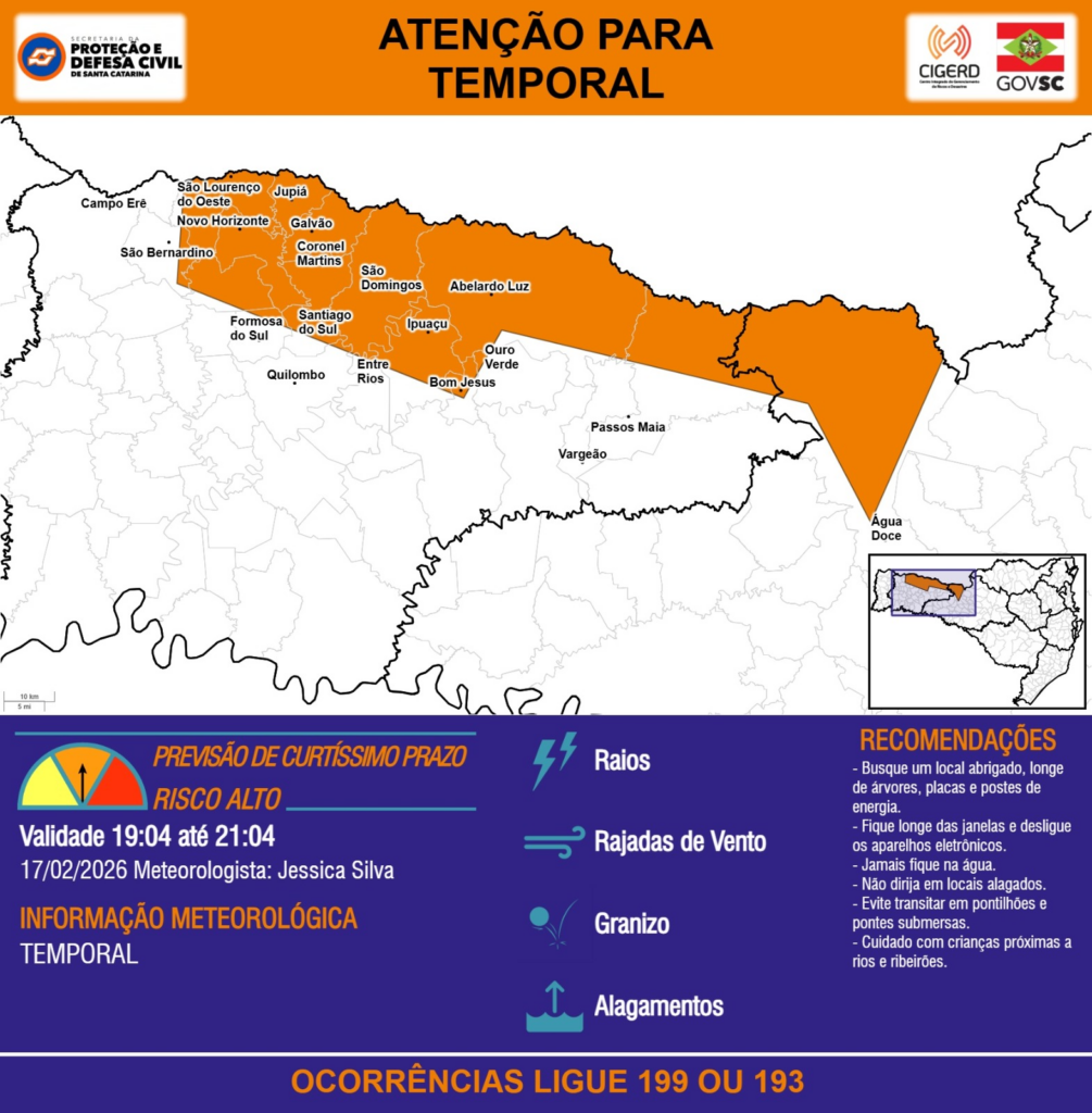 ATENÇÃO – 17/02 19:04 – TEMPORAL com RAIOS, RAJADAS DE VENTO, GRANIZO e ALAGAMENTOS para os municípios de Abelardo Luz, Bom Jesus, Campo Erê, Coronel Martins, Entre Rios, Formosa do Sul, Galvão, Ipuaçu, Jupiá, Novo Horizonte, Ouro Verde, Passos Maia, Quilombo, Santiago do Sul, São Bernardino, São Domingos, São Lourenço do Oeste, Vargeão e Água Doce nas próximas 2 horas. Ocorrências ligue 199 ou 193.