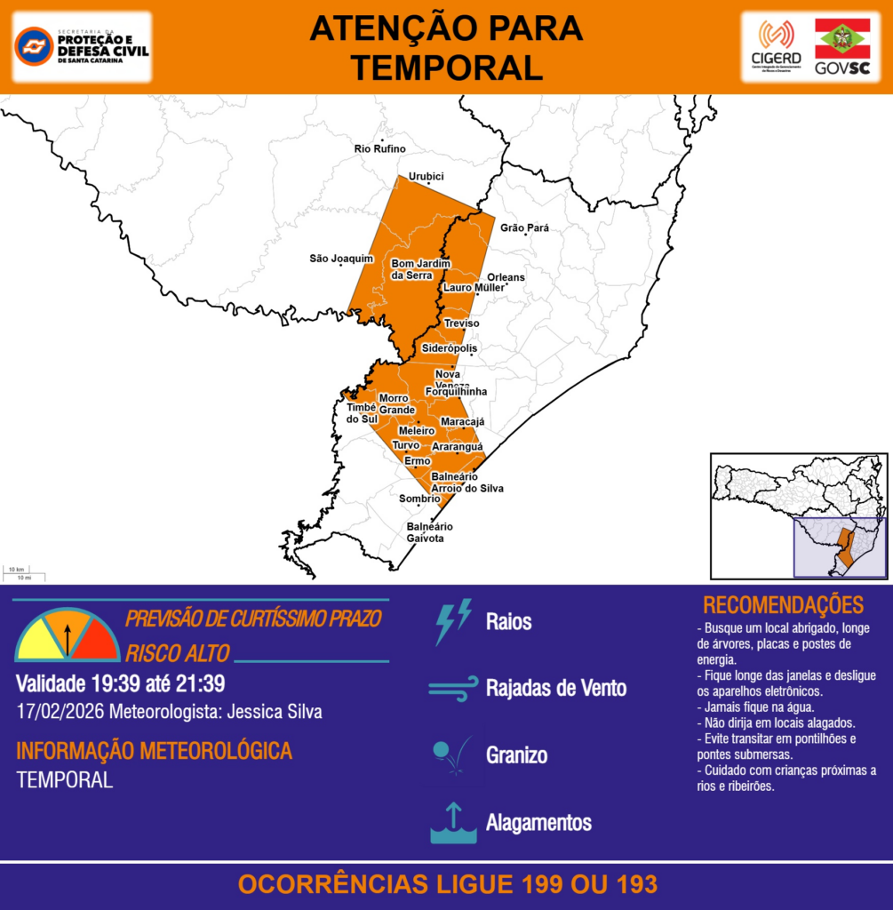 ATENÇÃO – 17/02 19:39 – TEMPORAL com RAIOS, RAJADAS DE VENTO, GRANIZO e ALAGAMENTOS para os municípios de Araranguá, Balneário Arroio do Silva, Balneário Gaivota, Bom Jardim da Serra, Ermo, Forquilhinha, Grão Pará, Lauro Müller, Maracajá, Meleiro, Morro Grande, Nova Veneza, Orleans, Rio Rufino, Siderópolis, Sombrio, São Joaquim, Timbé do Sul, Treviso, Turvo e Urubici nas próximas 2 horas. Ocorrências ligue 199 ou 193.