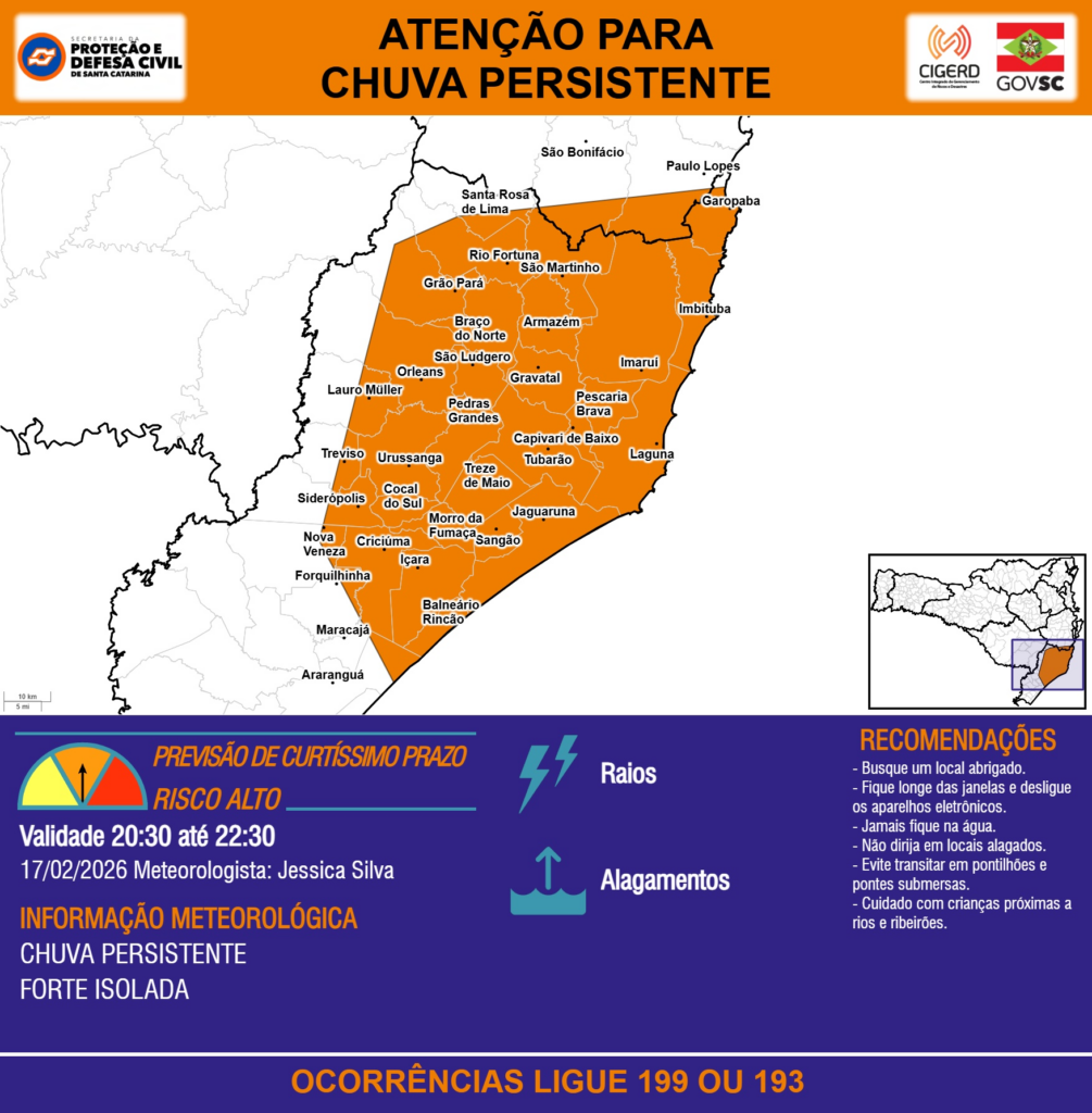 ATENÇÃO – 17/02 20:30 – CHUVA PERSISTENTE de intensidade forte isolada com RAIOS e ALAGAMENTOS para os municípios de Araranguá, Armazém, Balneário Rincão, Braço do Norte, Capivari de Baixo, Cocal do Sul, Criciúma, Forquilhinha, Garopaba, Gravatal, Grão Pará, Imaruí, Imbituba, Içara, Jaguaruna, Laguna, Lauro Müller, Maracajá, Morro da Fumaça, Nova Veneza, Orleans, Paulo Lopes, Pedras Grandes, Pescaria Brava, Rio Fortuna, Sangão, Santa Rosa de Lima, Siderópolis, São Bonifácio, São Ludgero, São Martinho, Treviso, Treze de Maio, Tubarão e Urussanga nas próximas 2 horas. Ocorrências ligue 199 ou 193.