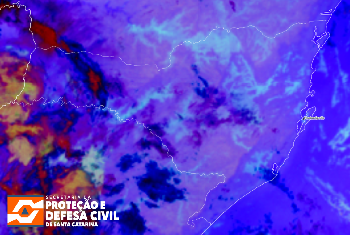 A terça-feira (17) vai começando com tempo firme em praticamente todo o estado, apenas com a de névoa/nevoeiro em áreas dos Planaltos e do Vale do Itajaí (tons azul claro na imagem) e a presença de nuvens mais altas com algum desenvolvimento se aproximando do Extremo Oeste (tons mais avermelhados), onde há registros de chuvisco/ chuva fraca, no momento. As temperaturas oscilam entre 19 e 25°C no Oeste, Litoral e Vale do Itajaí e entre 16 e 22°C nos Planaltos, com valores menores nas áreas mais altas. Nas próximas horas, a nebulosidade deve diminuir em todo o estado e o sol passa a predominar. Não há risco para ocorrências meteorológicas.