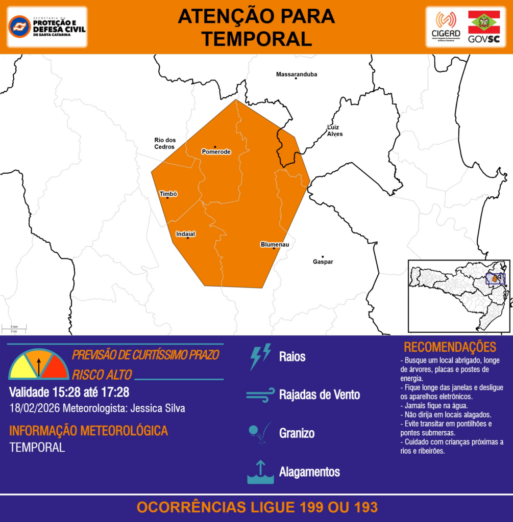 ATENÇÃO – 18/02 15:28 – TEMPORAL com RAIOS, RAJADAS DE VENTO, GRANIZO e ALAGAMENTOS para os municípios de Blumenau, Gaspar, Indaial, Luiz Alves, Massaranduba, Pomerode, Rio dos Cedros e Timbó nas próximas 2 horas. Ocorrências ligue 199 ou 193.