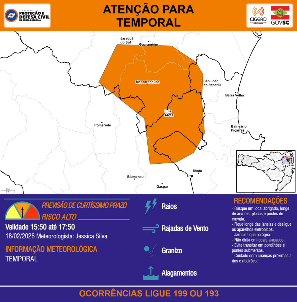 ATENÇÃO – 18/02 15:50 – TEMPORAL com RAIOS, RAJADAS DE VENTO, GRANIZO e ALAGAMENTOS para os municípios de Araquari, Balneário Piçarras, Barra Velha, Blumenau, Gaspar, Guaramirim, Ilhota, Jaraguá do Sul, Luiz Alves, Massaranduba, Navegantes, Pomerode e São João do Itaperiú nas próximas 2 horas. Ocorrências ligue 199 ou 193.