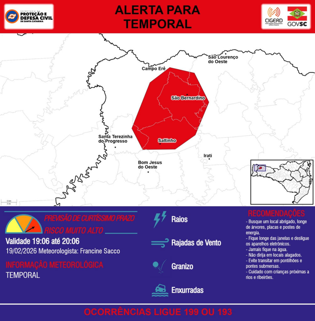 ALERTA – 19/02 19:06 – TEMPORAL com RAIOS, RAJADAS DE VENTO, GRANIZO e risco de ENXURRADAS para os municípios de Bom Jesus do Oeste, Campo Erê, Irati, Saltinho, Santa Terezinha do Progresso, São Bernardino e São Lourenço do Oeste na próxima hora. Ocorrências ligue 199 ou 193.