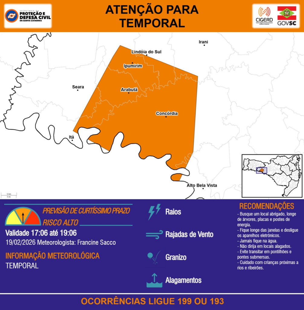 ATENÇÃO – 19/02 17:06 – TEMPORAL com RAIOS, RAJADAS DE VENTO, GRANIZO e ALAGAMENTOS para os municípios de Alto Bela Vista, Arabutã, Concórdia, Ipumirim, Irani, Itá, Lindóia do Sul e Seara nas próximas 2 horas. Ocorrências ligue 199 ou 193.