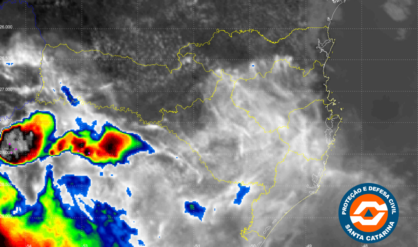 Animação: Imagens do satélite GOES-19, produto infravermelho realçado, entre às 12h30 e 14h40, horário local. Fonte: SDC/SC.