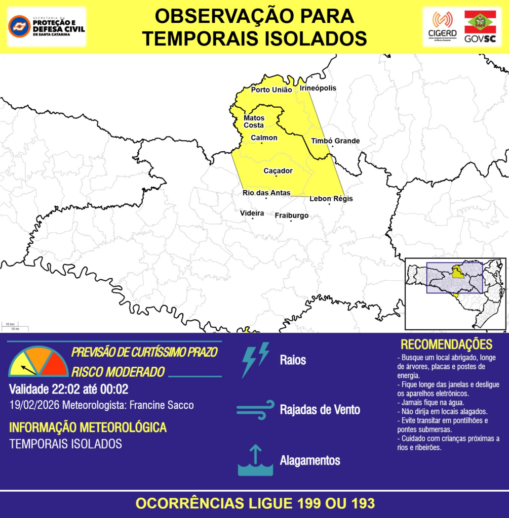 OBSERVAÇÃO – 19/02 22:02 – TEMPORAIS ISOLADOS com RAIOS, RAJADAS DE VENTO e ALAGAMENTOS pontuais para as regiões do Meio-Oeste, Planalto Norte e Planalto Sul nas próximas 2 horas. Ocorrências ligue 199 ou 193.