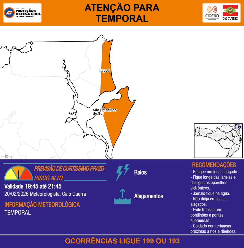 ATENÇÃO – 20/02 19:45 – TEMPORAL com RAIOS e ALAGAMENTOS para os municípios de Itapoá e São Francisco do Sul nas próximas 2 horas. Ocorrências ligue 199 ou 193.