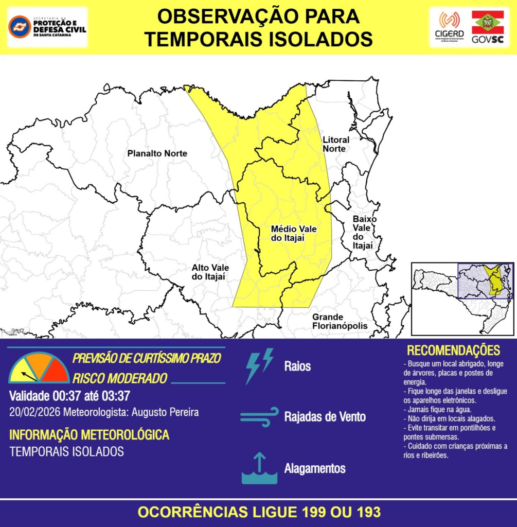 OBSERVAÇÃO – 20/02 00:37 – TEMPORAIS ISOLADOS com RAIOS, RAJADAS DE VENTO e ALAGAMENTOS pontuais para as regiões do Planalto Norte, Litoral Norte, Grande Florianópolis, Baixo, Médio e Alto Vale do Itajaí nas próximas 3 horas. Ocorrências ligue 199 ou 193.