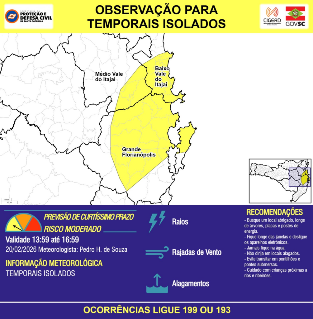 OBSERVAÇÃO – 20/02 13:59 – TEMPORAIS ISOLADOS com RAIOS, RAJADAS DE VENTO e ALAGAMENTOS pontuais para áreas das regiões da Grande Florianópolis, Baixo e Médio Vale do Itajaí nas próximas 3 horas. Ocorrências ligue 199 ou 193.