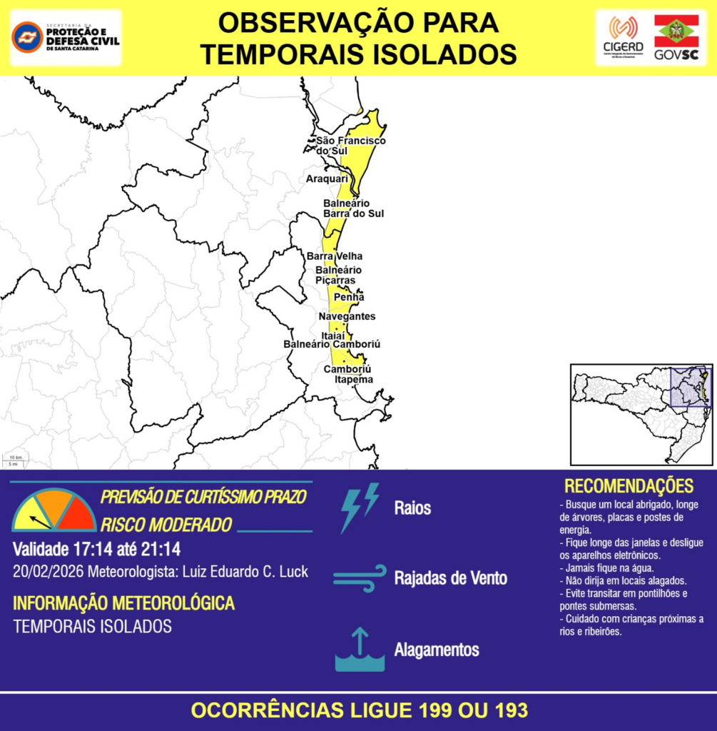 OBSERVAÇÃO – 20/02 17:14 – TEMPORAIS ISOLADOS com RAIOS, RAJADAS DE VENTO e ALAGAMENTOS pontuais para os municípios de Araquari, Balneário Barra do Sul, Balneário Camboriú, Balneário Piçarras, Barra Velha, Camboriú, Itajaí, Itapema, Navegantes, Penha e São Francisco do Sul nas próximas 4 horas. Ocorrências ligue 199 ou 193.