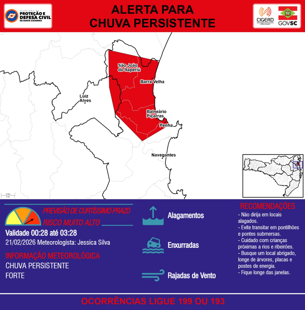 ALERTA – 21/02 00:28 – CHUVA PERSISTENTE de intensidade forte com ALAGAMENTOS, RAJADAS DE VENTO e risco de ENXURRADAS para os municípios de Balneário Piçarras, Barra Velha, Luiz Alves, Navegantes, Penha e São João do Itaperiú nas próximas 3 horas. Ocorrências ligue 199 ou 193.