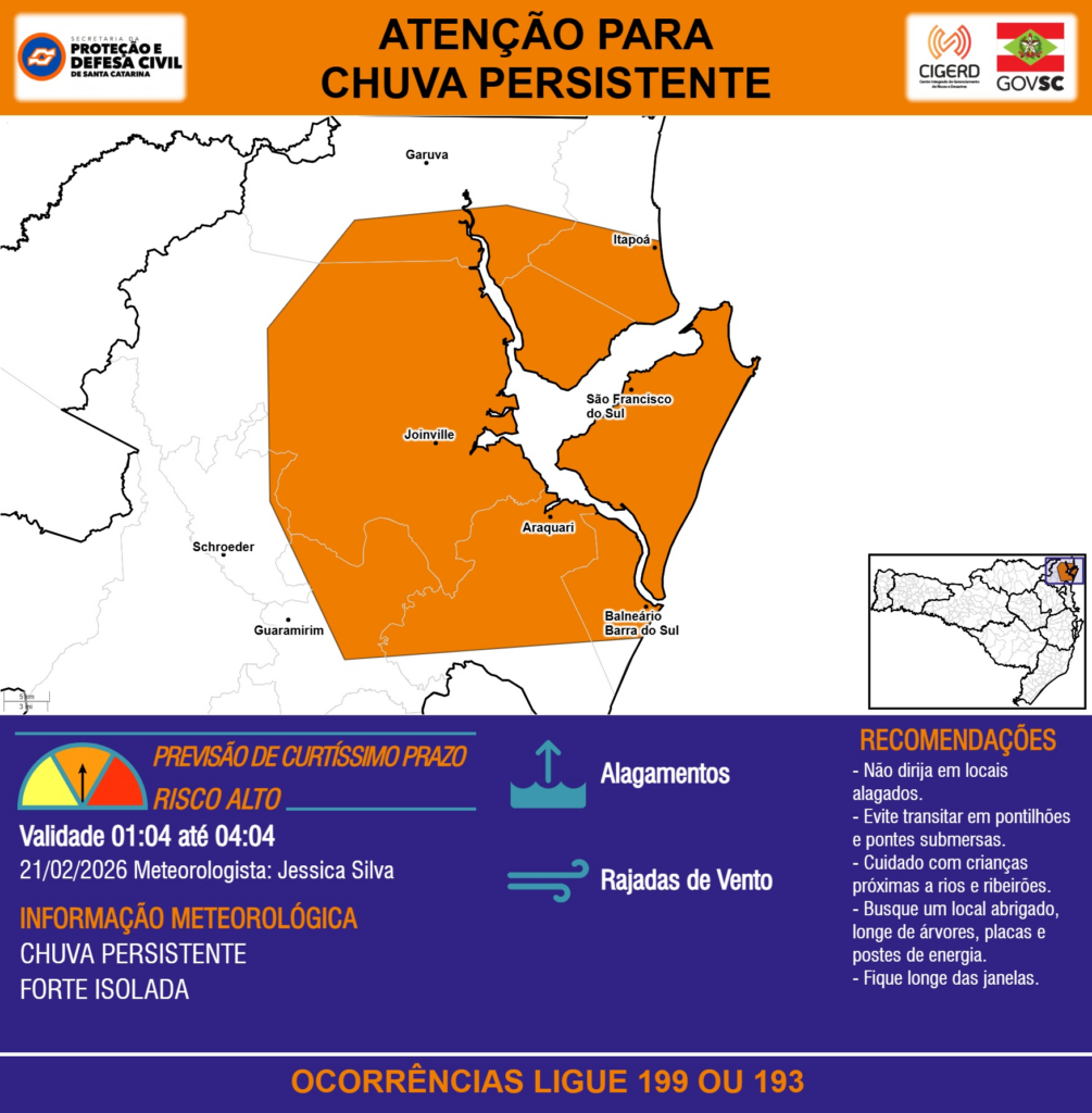 ATENÇÃO – 21/02 01:04 – CHUVA PERSISTENTE de intensidade forte isolada com ALAGAMENTOS e RAJADAS DE VENTO para os municípios de Araquari, Balneário Barra do Sul, Garuva, Guaramirim, Itapoá, Joinville, Schroeder e São Francisco do Sul nas próximas 3 horas. Ocorrências ligue 199 ou 193.
