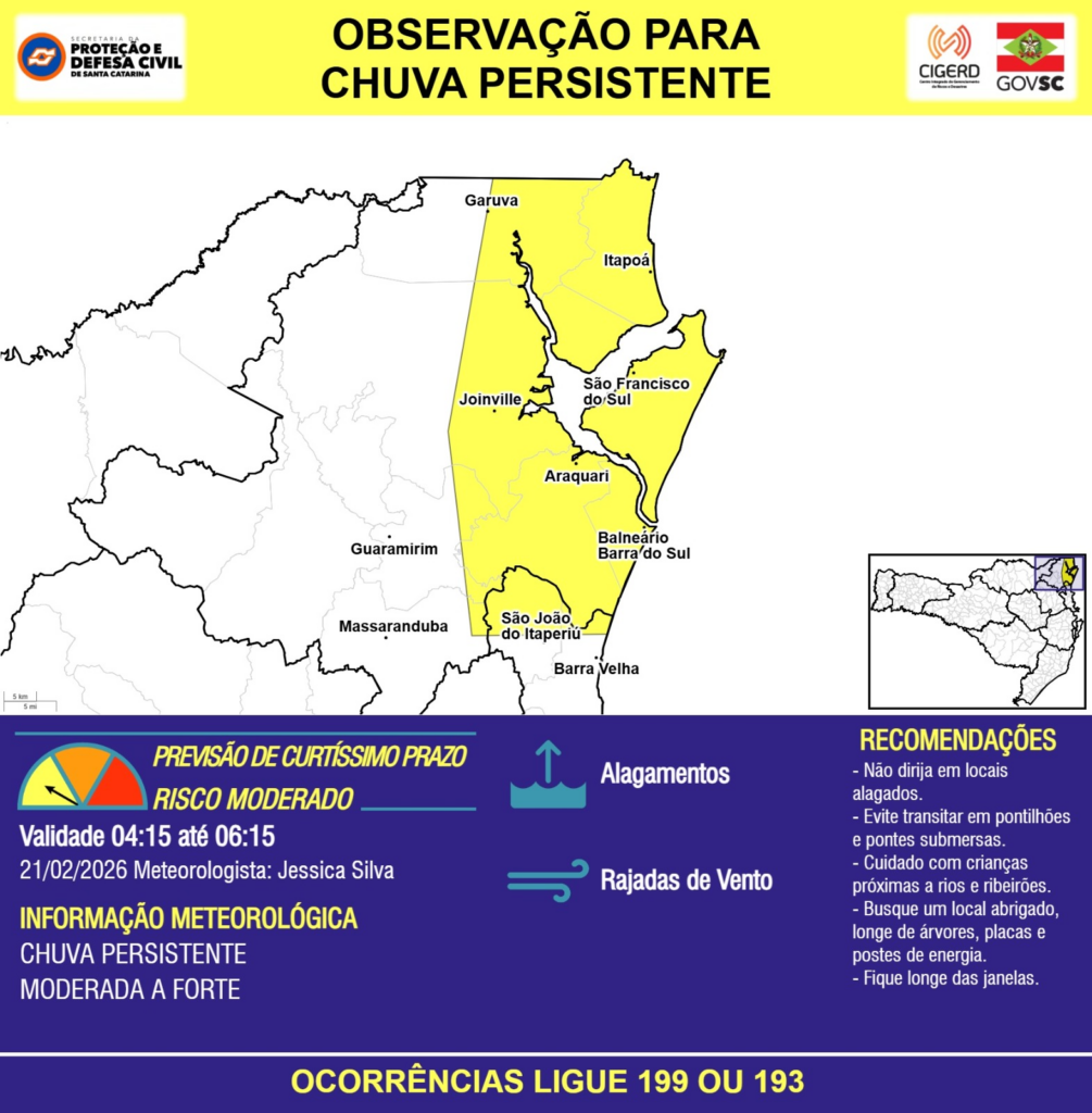 OBSERVAÇÃO – 21/02 04:15 – CHUVA PERSISTENTE de intensidade moderada a forte com RAJADAS DE VENTO e ALAGAMENTOS pontuais para os municípios de Araquari, Balneário Barra do Sul, Barra Velha, Garuva, Guaramirim, Itapoá, Joinville, Massaranduba, São Francisco do Sul e São João do Itaperiú nas próximas 2 horas. Ocorrências ligue 199 ou 193.
