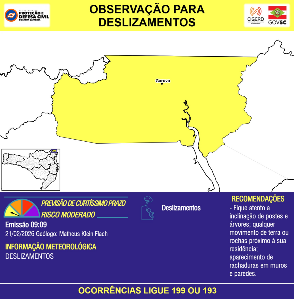 OBSERVAÇÃO – 21/02 09:09 – Risco de DESLIZAMENTOS para o município de Garuva. Ocorrências ligue 199 ou 193.