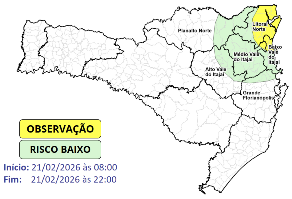 Após o avanço da frente fria, a circulação marítima associada a uma área de alta pressão no oceano, mantém o tempo instável no Litoral e em áreas próximas, com chuva persistente, e por alguns momentos intensa, no decorrer deste sábado (21), especialmente entre o Baixo Vale do Itajaí e o Litoral Norte. O risco é BAIXO a MODERADO, para ocorrências associadas a alagamentos e deslizamentos pontuais pontuais.
